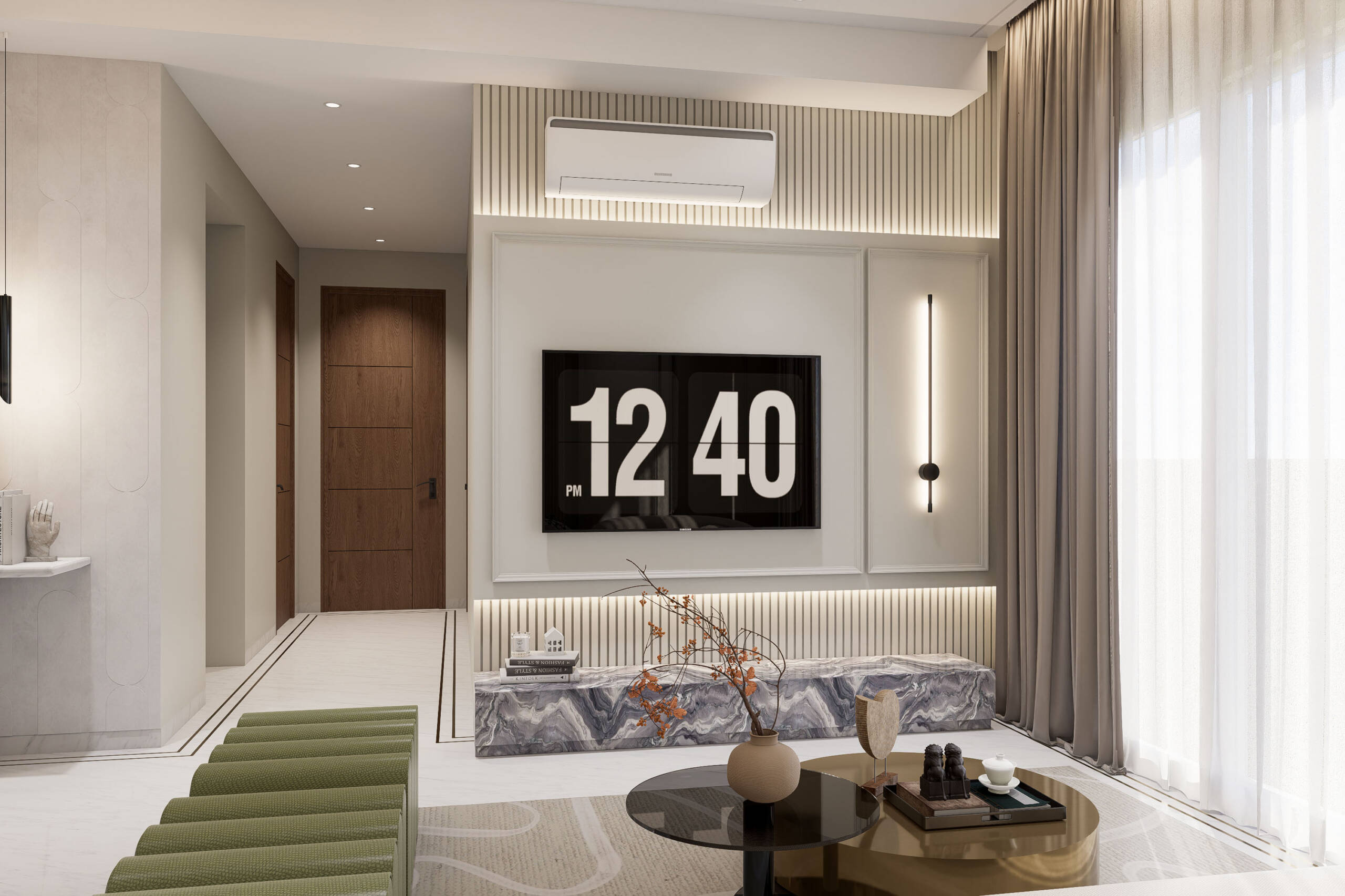 The Central Park Residence is a thoughtfully designed 2BHK apartment where modern elegance meets everyday comfort. The interior concept focuses on creating a calm and balanced environment through soft neutral tones, refined materials, and carefully curated lighting.The living area is designed as the central social space of the home, combining contemporary furniture with subtle textures and warm lighting to create a welcoming atmosphere. Clean wall paneling, elegant chandeliers, and layered lighting enhance the sense of sophistication while maintaining visual simplicity.