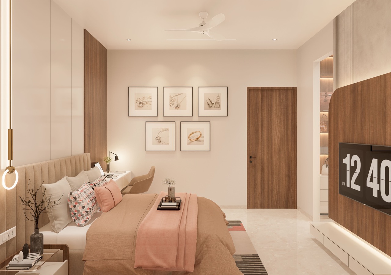 A dedicated mandir area becomes a focal point of the home, designed with intricate detailing and soft illumination to create a peaceful spiritual corner. The design balances tradition with contemporary aesthetics, making the space both meaningful and visually refined.The kitchen and storage areas are designed with efficiency and elegance in mind. Custom cabinetry, integrated appliances, and warm material finishes ensure the space remains functional while maintaining the home’s cohesive design language.Across the residence, thoughtful material selection, custom furniture elements, and carefully layered lighting enhance the feeling of comfort and sophistication. Every detail has been designed to support the lifestyle of the family while creating a timeless and harmonious interior environment.