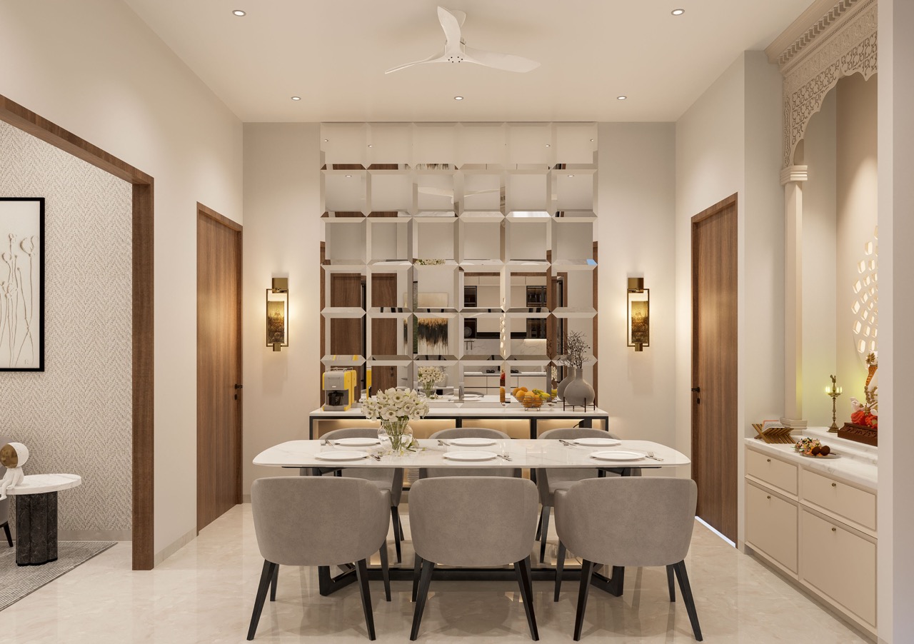 The Malhotra Residence is designed as a warm and elegant family home where modern functionality meets refined design. The interiors follow a neutral palette of soft beige tones, natural textures, and subtle lighting to create a calm and welcoming atmosphere throughout the home.The dining and living spaces are thoughtfully planned to encourage connection and comfort. Clean architectural lines, soft wall treatments, and carefully placed lighting elements create a sophisticated yet inviting environment for everyday living and gatherings.